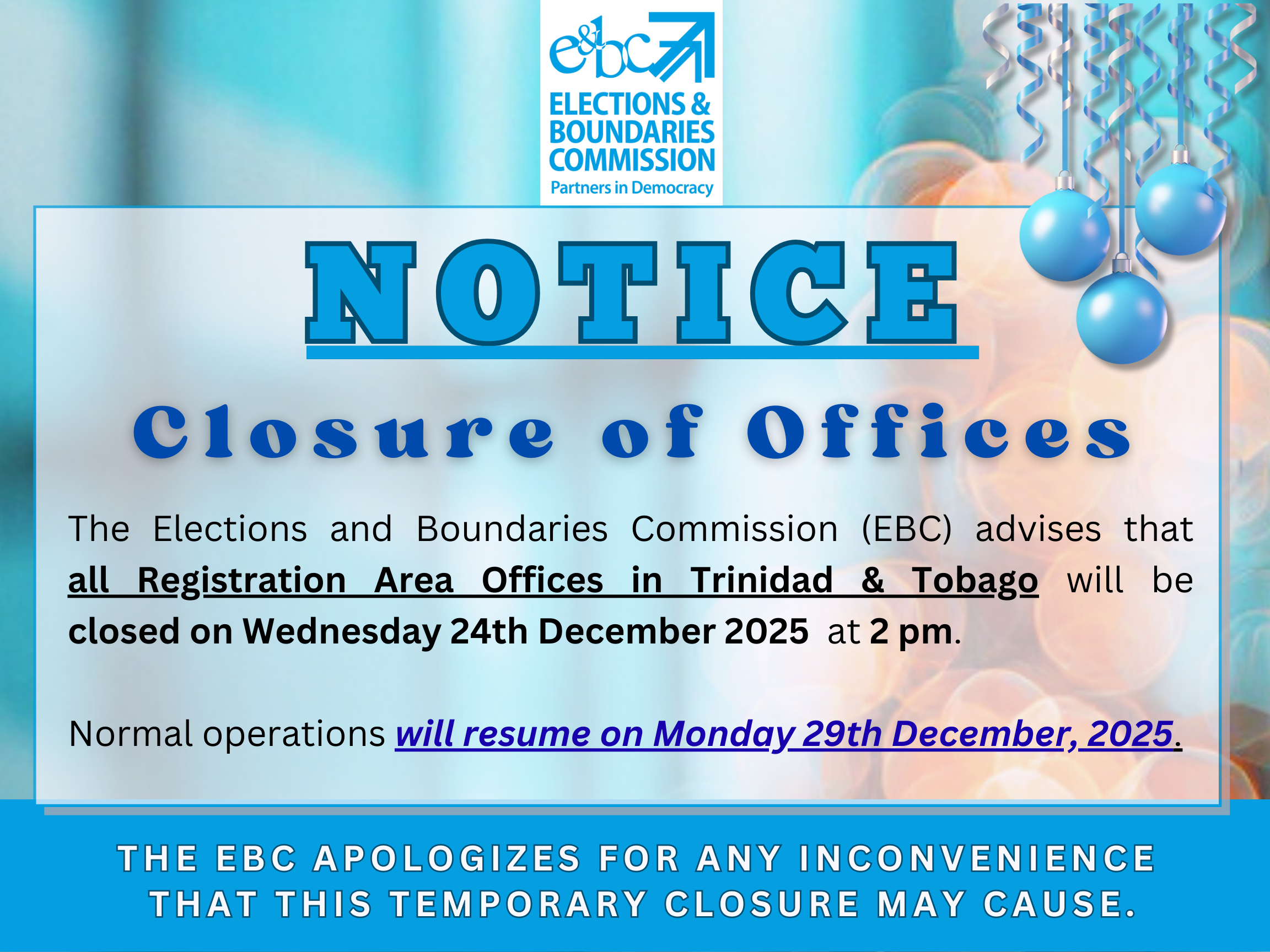 Temporary Closure of the EBC’s Registration Area Offices for Chaguanas and Tabaquite/Talparo2022-01-232022-01-23Featured, Media Releases, News
